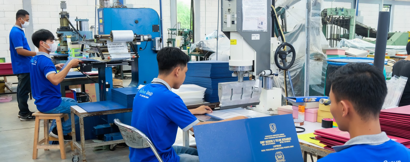 Pembuatan map rapor, map ijazah, dan map portofolio dari bahan plastik polypropylene yang ramah lingkungan. Produk ini sudah bersertifikat EKOLABEL.